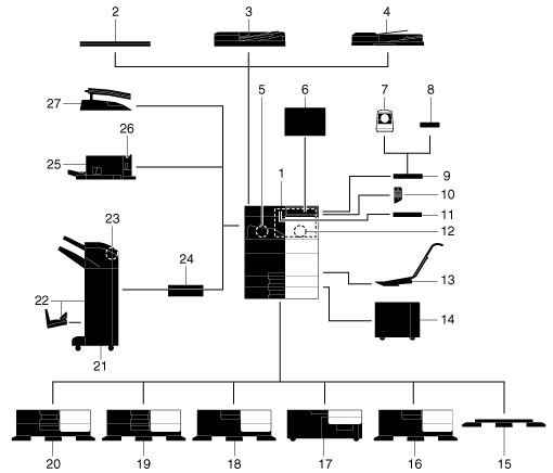 19 | Paper Feed Cabinet PC-216 | Allows you to load up to 500 sheets respectively in the top and bottom trays. This unit is referred to as Double Paper Feed Cabinet in the manual. |