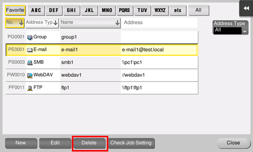 Tap [Utility] - [One-Touch/User Box Registration] - [Create One-Touch Destination] - [Address Book (Public)].