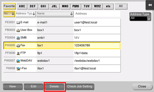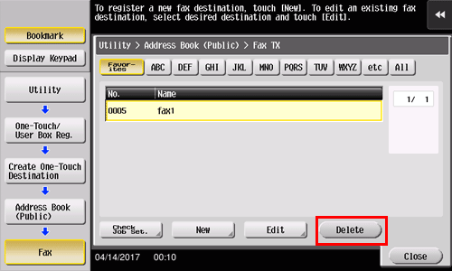 Tap [Utility] - [One-Touch/User Box Registration] - [Create One-Touch Destination] - [Address Book (Public)].