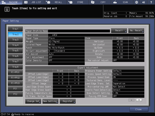 In this example, change Paper Type and Weight in the paper settings of Tray 2, and register them as a new profile.