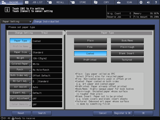 • supplementary explanationThe Change IndividualSet screen provides the following settings: Paper Type, Paper Size, Weight, Colored Paper, Punch, Both Sides Adj., RU Curl Adj., Air Assist, Expert Adj., Curl Adjustment, and Color Density. Some items are not displayed depending on the tray to be used or conditions.
