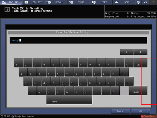 9. Press Recall, check that the paper profile is registered, then press OK.