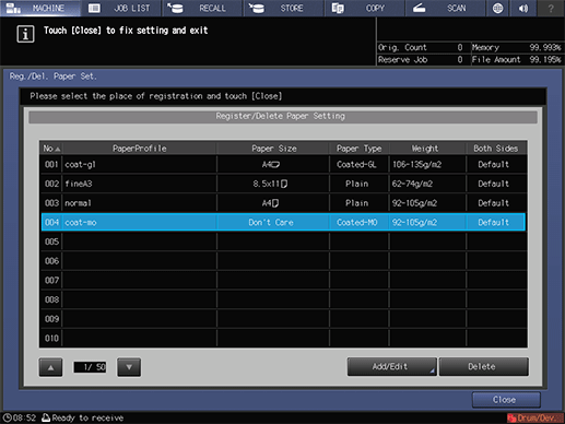 • supplementary explanationThe paper profile registered can be edited or deleted on the Reg./Del. Paper Set. screen.