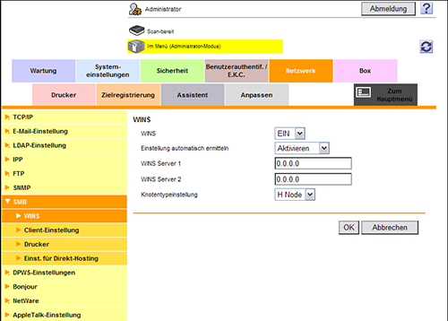Wählen Sie im Administratormodus [Netzwerk] - [SMB] - [WINS/NetBIOS Einstellung] aus und konfigurieren Sie dann die folgenden Einstellungen.