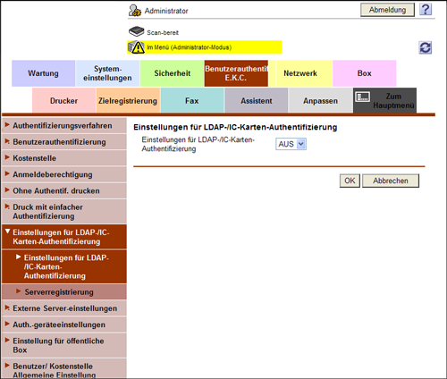 Wählen Sie im Administratormodus [Benutzerauthentif. / E.K.C.] - [Einstellungen für LDAP-/IC-Karten-Authentifizierung] - [Einstellungen für LDAP-/IC-Karten-Authentifizierung] und setzen Sie [Einstellungen für LDAP-/IC-Karten-Authentifizierung] auf [EIN] (Standard: [AUS]).