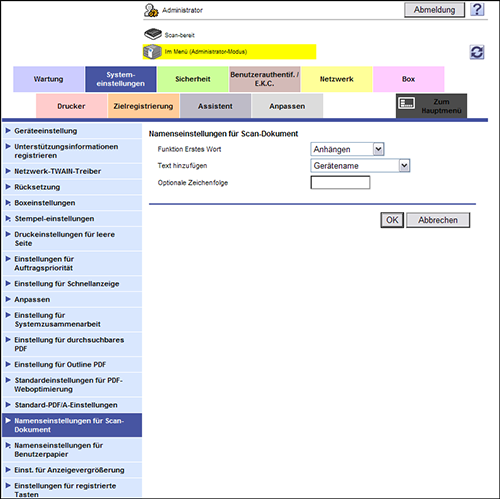 Wählen Sie im Administratormodus [Systemeinstellungen] - [Namenseinstellungen für Scan-Dokument] und richten Sie dann die folgenden Einstellungen ein.