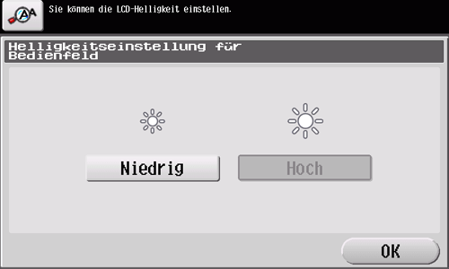 Tippen Sie auf [Voreinstellung] - [Helligkeitseinstellung für Bedienfeld] und wählen Sie [Niedrig] oder [Hoch] aus, um die Helligkeit einzustellen.