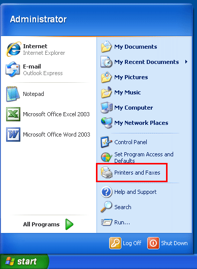 In Windows XP/Server 2003, open the Start menu, then click [Printers and Faxes].