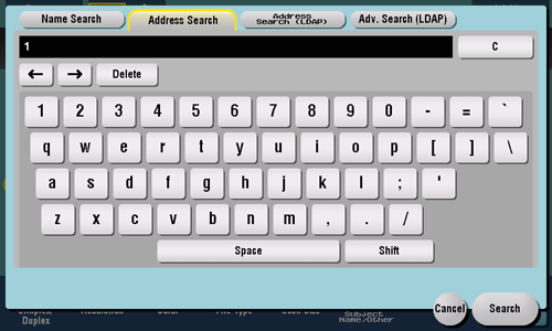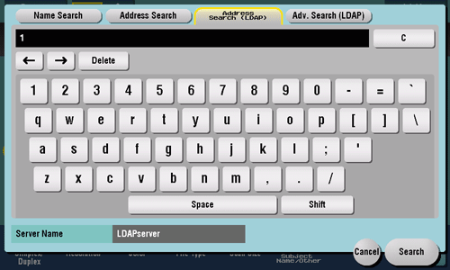 Tap [Addr. Search] - [Search] - [Address Search (LDAP)] or [Adv. Search (LDAP)].