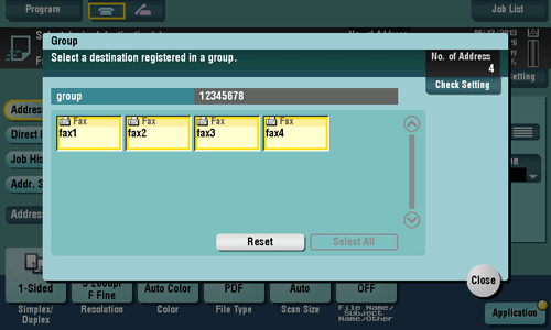 When a group destination is selected in [Address Book], select the destinations you want send data among the destinations registered in the group. If there is certain destination that you want to delete from sending data among the destinations registered in the group, tap [Select All], then tap the target destination to deselect.