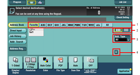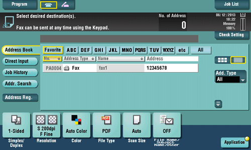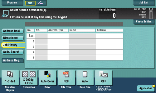 The history shows the latest five fax destinations. When necessary, multiple destinations can be selected from the history.