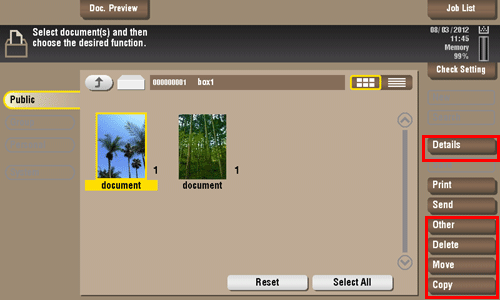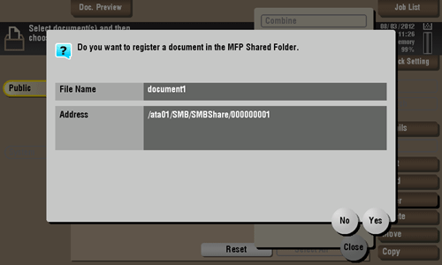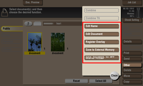 Select a file, then tap [Other] - [Save Document to MFP Shared Folder]. Now you can register files saved in the Public User Box in an SMB sharing folder.