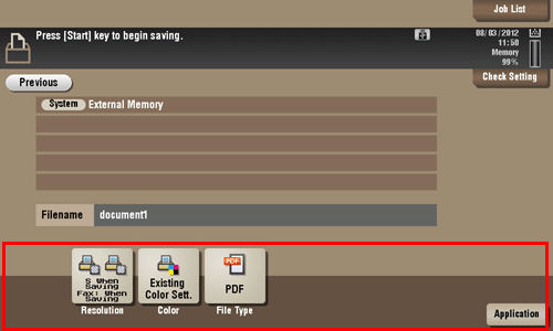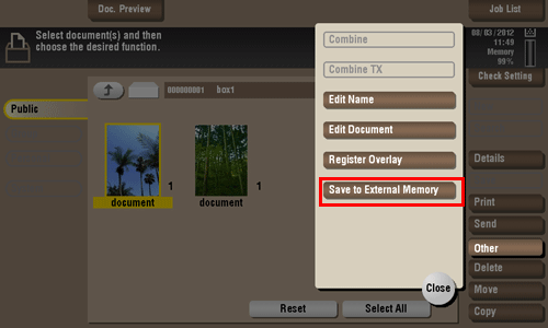 Insert a USB memory device into the USB port of this machine, select a file, then tap [Other] - [Save to External Memory]. Now you can save the file on the USB memory.