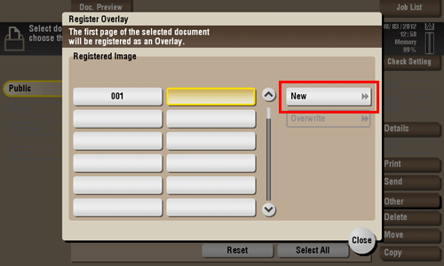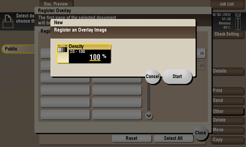 Once registered, you can compose an overlay image on the original during copy or printing from the PC. Also, you can compose an overlay image onto a User Box file during file printing.