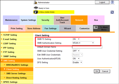 In the administrator mode, select [Network] - [SMB Setting] - [Client Setting], then configure