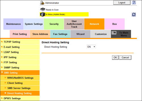 In the administrator mode, select [Network] - [SMB Setting] - [Direct Hosting Setting], and then set [Direct Hosting Setting] to [ON]. You can use this function with the default settings unless otherwise requested.