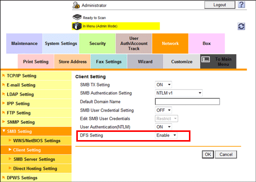 In the administrator mode, select [Network] - [SMB Setting] - [Client Setting], and set [DFS