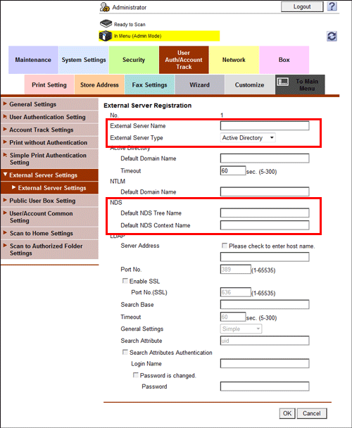 In the administrator mode, select [User Auth/Account Track] - [External Server Settings] - [Edit], then configure the following settings.