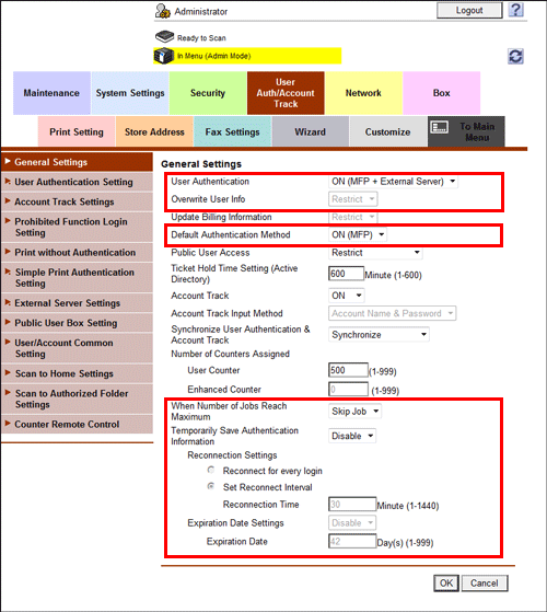 In the administrator mode, select [User Auth/Account Track] - [General Settings], then configure the following settings.