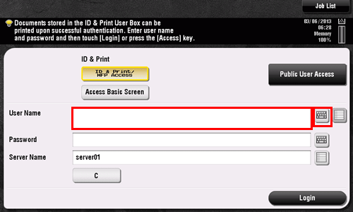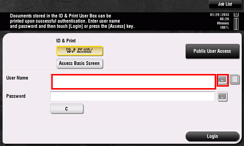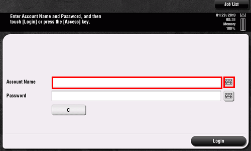 Enter the user or account track name and the password on the Login screen, then tap [Login] or [Access] to perform authentication. After intended operation was finished, tap [Access] to log out.