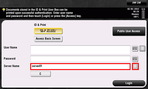 Enter the user name and the password, and select a server to be authenticated. The contents of the Login screen may vary depending on the authentication setting of this machine.