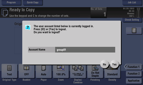 If authentication succeeds, you can log in to this machine. The account track name is displayed on the top section of the screen during login process. When User Authentication and Account Track are enabled together, the user name is displayed on the top section of the screen.