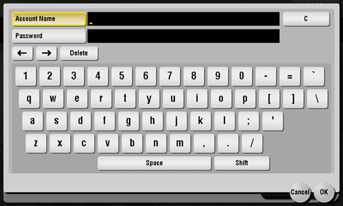 Enter the account name and the password to perform account track. The contents of the Login screen may vary depending on the authentication setting of this machine.