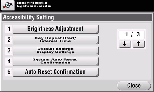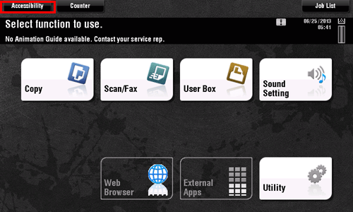 [Accessibility] is available when configuring the operating environment of the Control Panel, for example, adjusting a position to tap the Touch Panel or changing keying sounds.