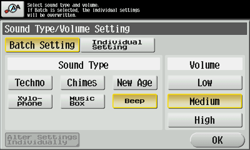 Set the sound type and volume for each [Operating Confirmation Sound], [Successful Completion Sound], [Completed Preparation Sound], [Caution Sound], [Deletion Sound], [Authentication Sound ]. When [Batch Setting] is selected, all the sound type and volume will be set at once. Select the sound type from six types and select the sound volume from [High][Medium][Low] for adjustment. When [Individual Setting] is selected, all the sound type and volume will be set separately. |