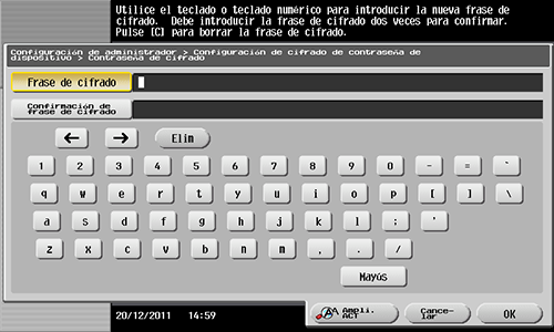 Toque [Frase de cifrado] e introduzca la nueva frase de cifrado (usando hasta 20 caracteres como máximo, incluyendo símbolos).