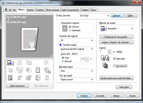 En la ficha [Básico], puede definir la configuración básica acerca del papel o la impresión. Las funciones utilizadas frecuentemente en la impresión normal se colocan en esta ficha.