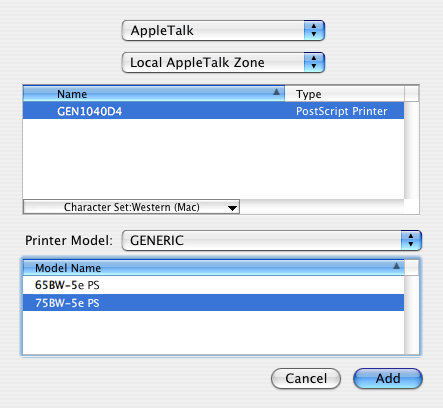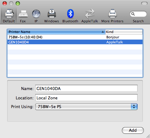 En Mac OS X 10.4/10.5, utilice el siguiente procedimiento para agregar una impresora con una conexión AppleTalk: