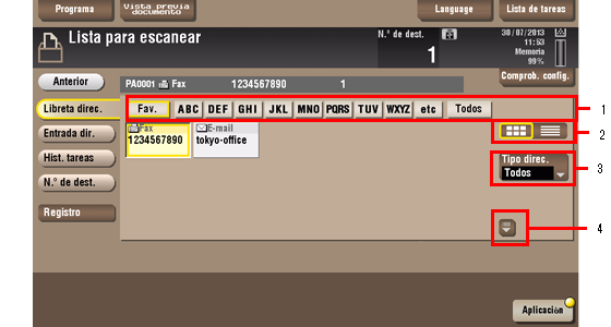 2 | Muestra los destinos registrados, ya sea como botones o en una lista. Si se cambia a la visualización de lista, puede clasificar los destinos por números de registro o en orden alfabético por los nombres de destino. |