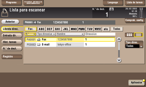 Si se registra un número mayor de destinos, puede buscar un destino por nombre de registro o destino (dirección de correo electrónico o nombre de PC).