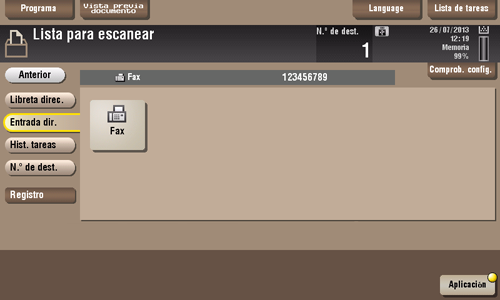 Seleccione [Entrada dir.], toque [Fax] y, a continuación, introduzca un número de fax.