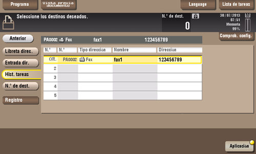 Pulse [Hist. tareas] y puede seleccionar un destino desde el historial de escáner o fax.
