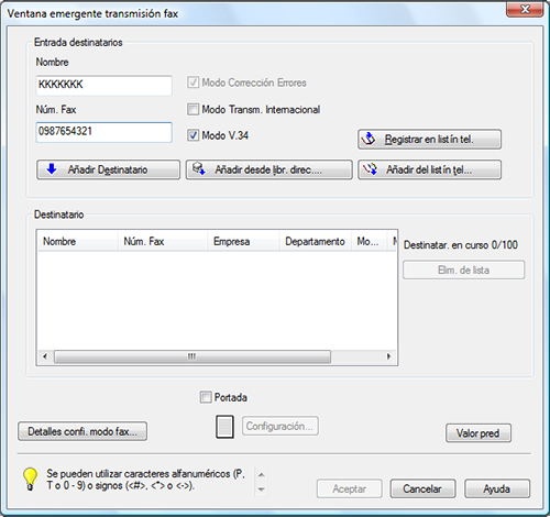 Cuando envía un fax a varios destinos, repita los pasos 6 y 7. Puede registrar hasta 100 destinatarios.