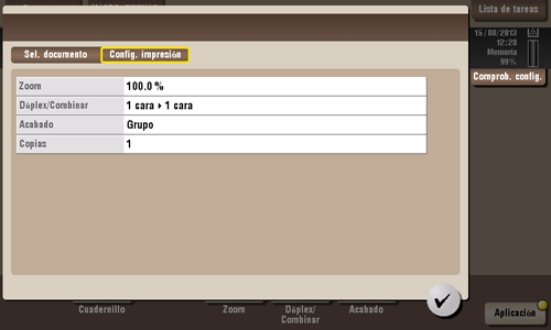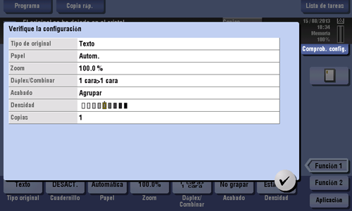 Toque [Comprob. config.] en la pantalla principal del modo copia para mostrar los ajustes actuales.