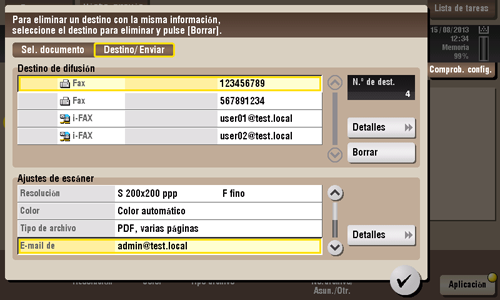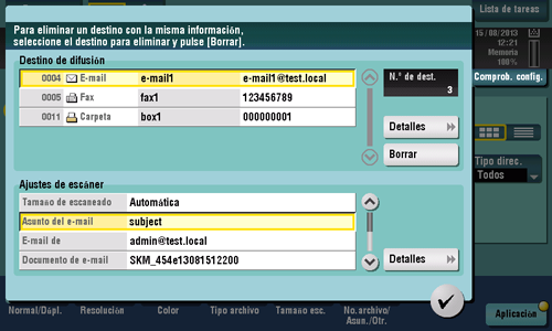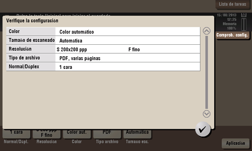Toque [Comprob. config.] en la pantalla principal del modo escáner/fax para mostrar las direcciones especificadas o los ajustes actuales.