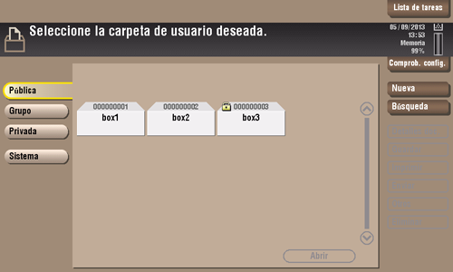 Para acceder a un archivo de una carpeta de usuario, seleccione la carpeta de usuario deseada y, a continuación, toque [Abrir].