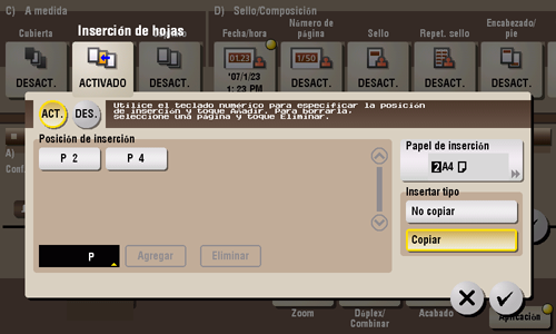 Seleccione [ACT.] para especificar la opción Inserción de hojas.