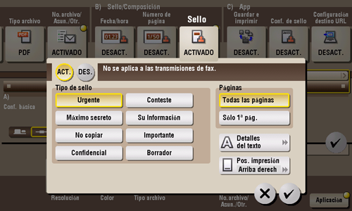 [ACT.]/[DES.] | Seleccione [ACT.] para imprimir un sello. |