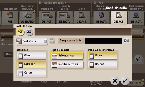 [Date/Time] | Seleccione un formato para la fecha y hora que debe imprimirse. Seleccione la casilla [Fecha/hora] y toque el icono de la parte derecha de la pantalla; a continuación, se puede seleccionar un formato de Fecha/hora desde el menú de acceso directo. |