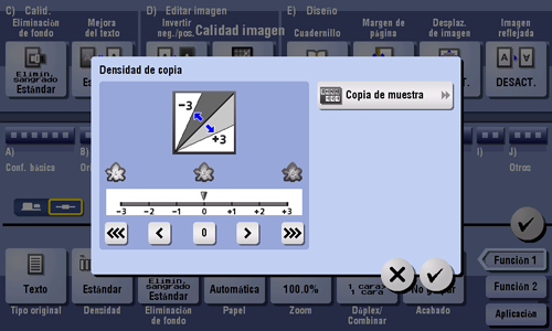 [Copia de muestra] | Puede comprobar el acabado imprimiendo una copia de muestra. Coloque el original en el cristal de originales y toque [Aceptar] o pulse Inicio. |