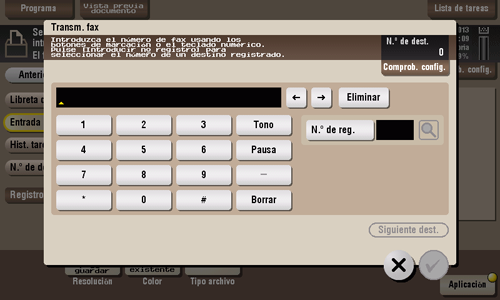 Introduzca el número de fax del destinatario al que debe enviarse el fax. Al especificar varios destinos, toque [Siguiente dest.] para añadir destinos.