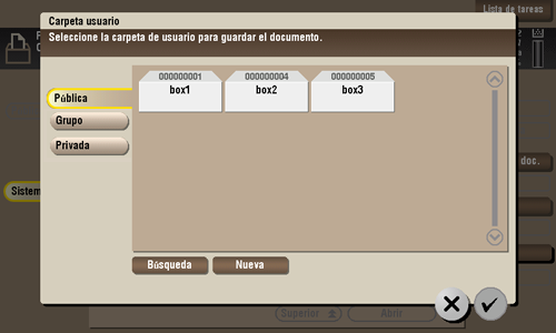 [Búsqueda] | Esta ventana se utiliza para buscar una carpeta de usuario. Las carpetas de usuario se muestran en función de los caracteres de búsqueda que se hayan especificado durante el registro de carpetas. También se puede especificar un número de carpeta de usuario directamente desde el Teclado. Para mostrar el teclado, toque el área de entrada numérica. |