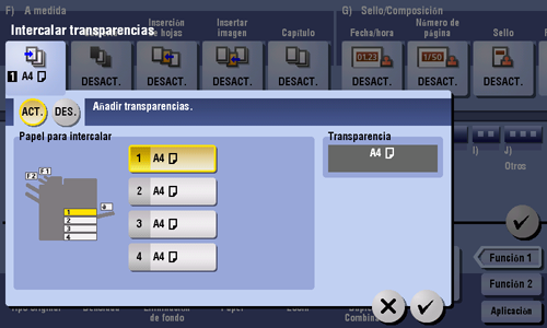 [Papel para intercalar] | Seleccione la bandeja para el papel que se va a insertar entre las transparencias. El tamaño de las transparencias cargadas en la bandeja manual se muestra en [Transparencia]. Asegúrese de utilizar el mismo papel para transparencias cargadas y para el papel que se va a insertar. |