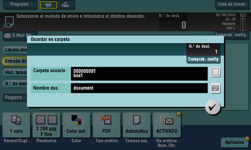 Seleccione una carpeta de usuario para guardar datos de originales escaneados en la carpeta de usuario de esta máquina. Si es necesario, cambie el nombre del archivo para guardarlo.