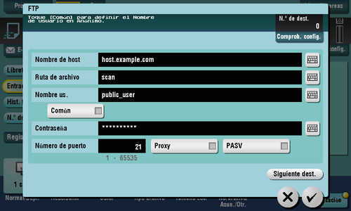 Introduzca un nombre de host del servidor FTP de destino o una dirección IP cuando se envíen datos de originales escaneados a un servidor FTP.