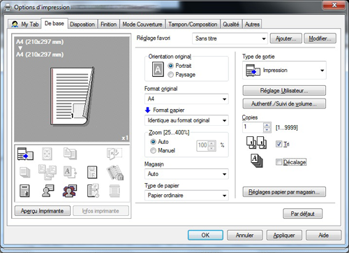 Dans la fenêtre [Préférences d'impression], définissez les conditions d'impression que vous voulez enregistrer en tant que favori.
